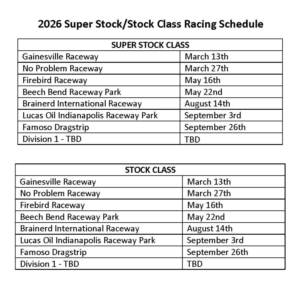 The Super Stock/Stock Class Racing schedule will include races at Gainesville Raceway on March 13, No Problem Raceway on March 27, Firebird Raceway on May 16, Beech Bend Raceway Park on May 22, Brainerd International Raceway on Aug. 14, Indianapolis, Famoso Dragstrip on Sept. 26 and Maple Grove Raceway on Oct. 23.